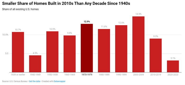 According to RedFin, only 12.1% of US homes were built between 2010 and 2023, 14.9% were constructed between 2000 and 2009, and the rest of the 73% of the homes were built in the 1900s and early 2000s.