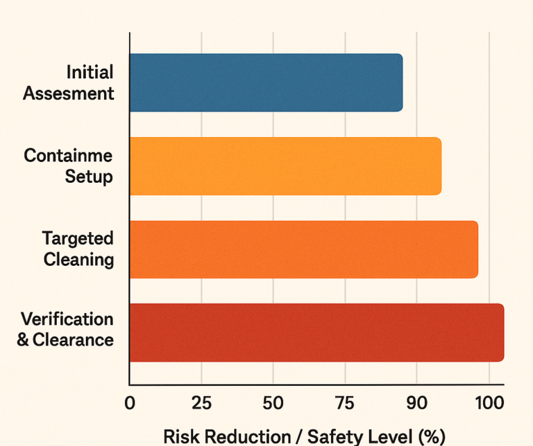 - Verification & Clearance – Includes air sampling and surface testing to confirm that contamination has been eliminated to safe levels.